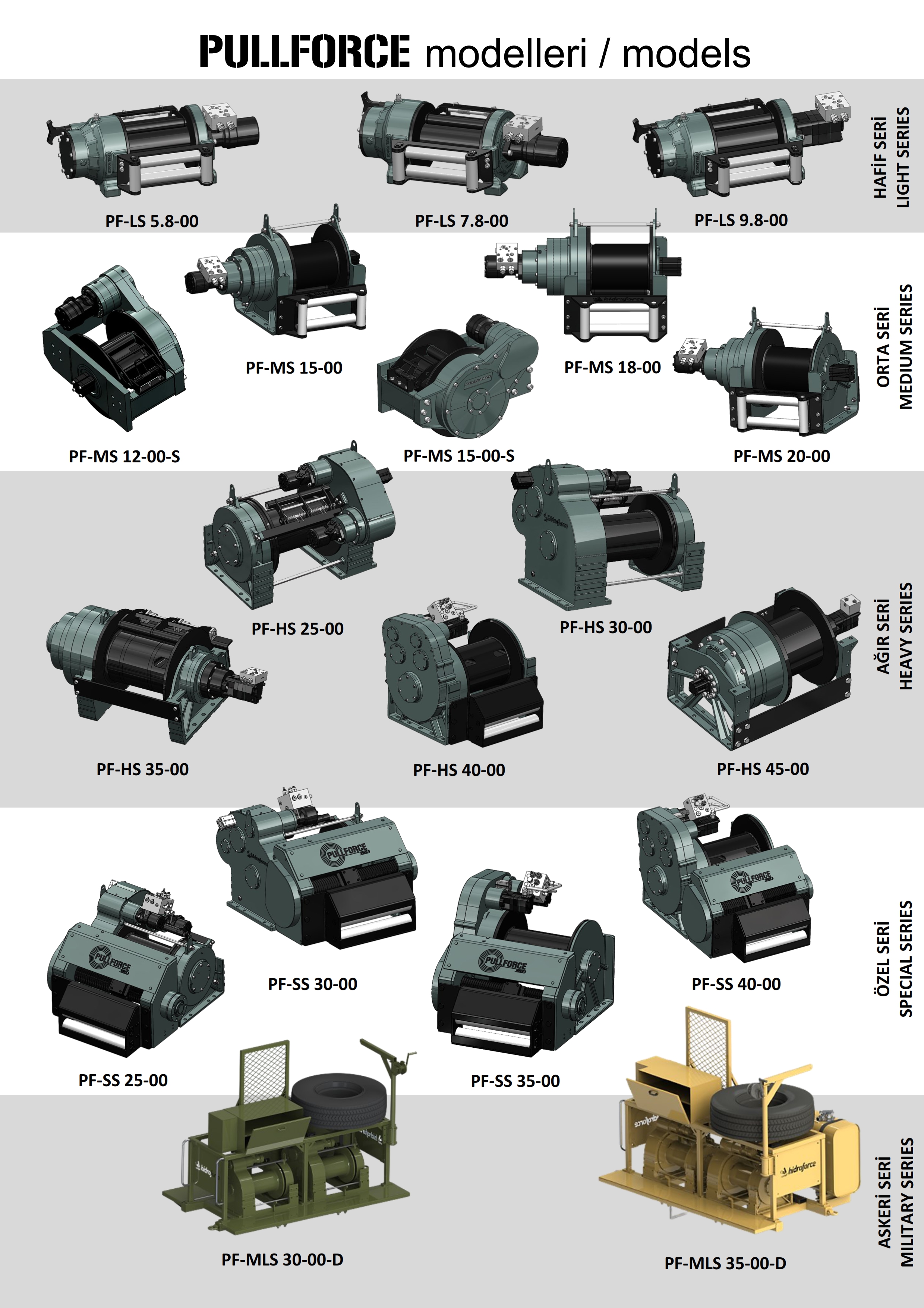 Pullforce Winch, sivil ve askeri uygulamalara hizmet eden hidrolik vinçlerin tasarımı ve üretiminde uzman bir şirkettir. Ayrıca, 6 ile 45 ton arasında değişen çekme kapasitesine sahip olan ve özel çözüm olarak birleştirilmiş setlerle 60 ve 70 ton kapasiteye ulaşan ekipmanlarımız, tüm arazi platformlarından ağır tank taşıyıcılarına kadar geniş bir araç yelpazesi için uyarlanabilir. Kalite ve performansa olan güçlü bağımız, tüm pullforce winch ünitelerinin zorlu koşullar altında başarılı sonuçlar elde etmesini sağlamaktadır.